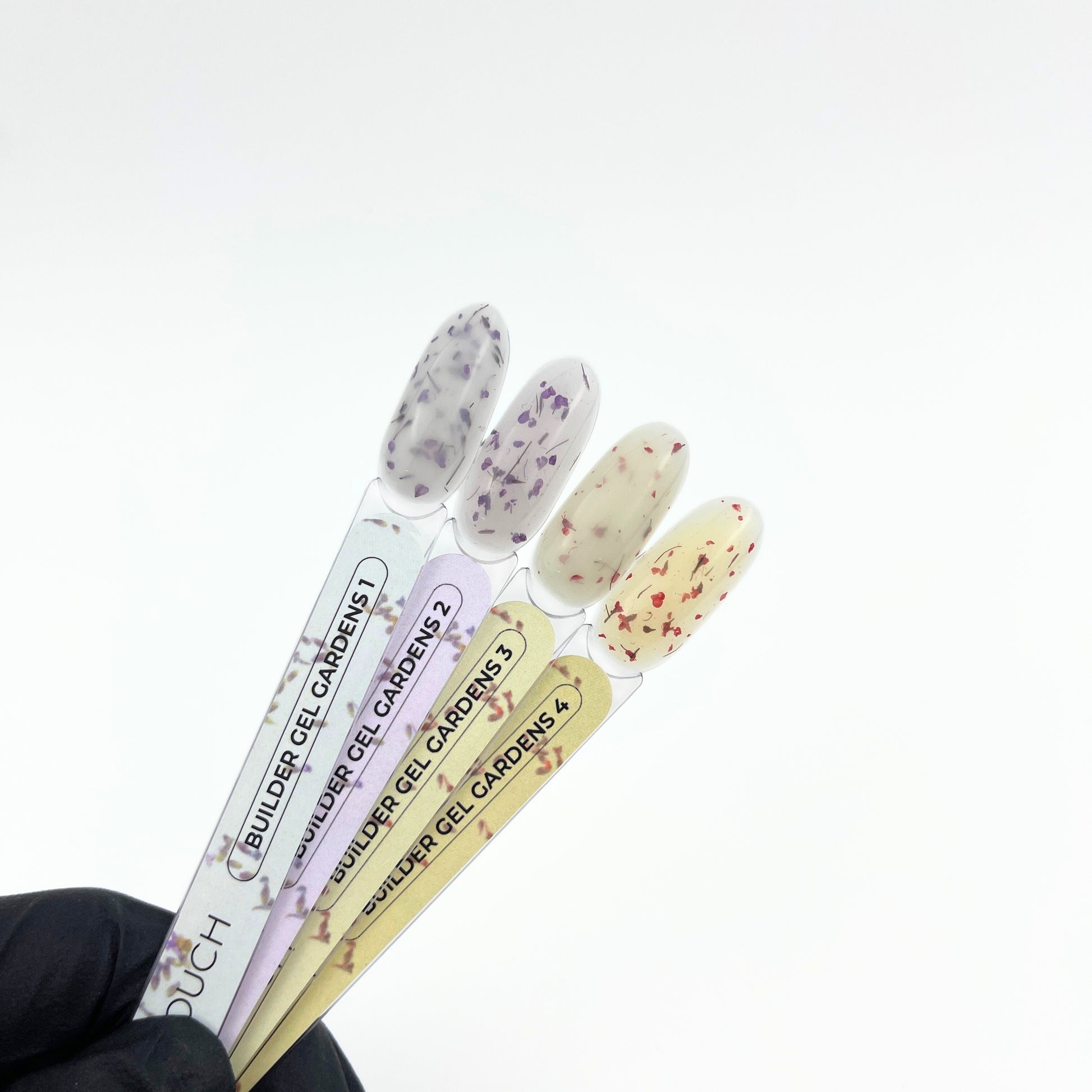 TOUCH BUILDER GEL GARDENS - това е камуфлажен изграждащ гел със сухи цветя, със средна вискозна консистенция. Притежава свойството да се саморазлива бързо и е много удобен за работа. Сухите цветя не създават допълнителен обем, лесен за работа с готов дизайн. Предлага се в 4 нюанса. Представен в обем от 15 мл (без четка).