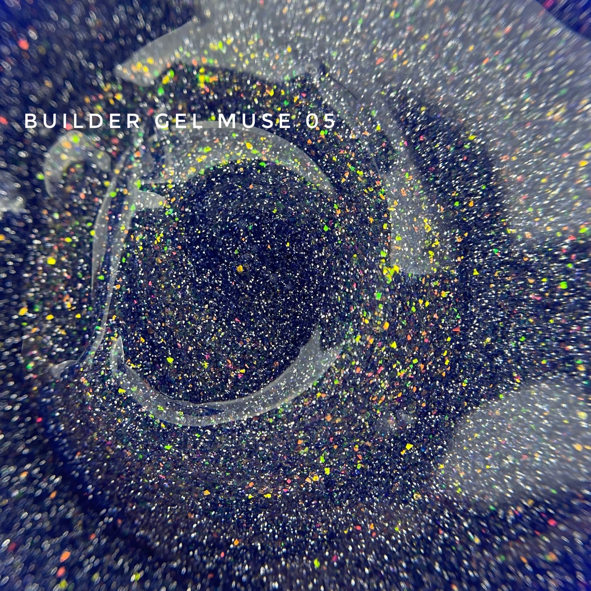 MUSE BUILDER GEL - Изграждащ гел със светлоотразителен брокат и люспи, добавени за подсилване на блясъка с цветна консистенция. Създават светлоотразителен ефект. На дневна светлина те осигуряват акцентен блясък, а под изкуствено осветление - дълбок сияен ефект. Включва 5 нюанса. Предлага се в обем от 15 мл (без четка).