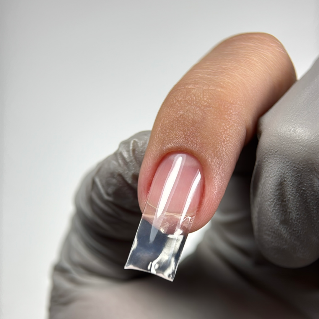 - При укрепване, не забравяйте да изпилите естествения нокът отдолу